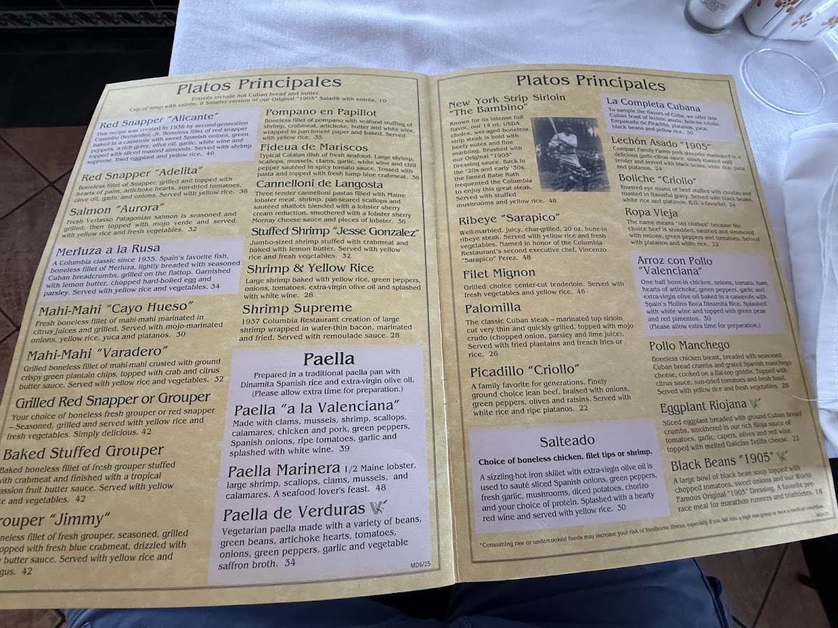 Boneless fillet of snapper, breaded and grilled. Garnished with lemon butter, chopped hard-boiled egg and parsley. Served with yellow rice. A classic Columbia dish that has been on the menu for decades.