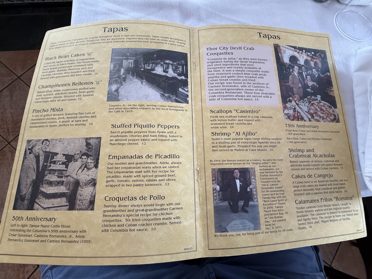 Sunday dinner always would begin with our grandmother and great-grandmother Carmen Hernandez' special recipe for chicken croquettes. Six fried croquettes made with chicken and Cuban cracker crumbs. Served with Columbia salsa picante.